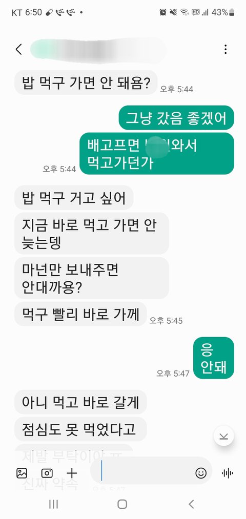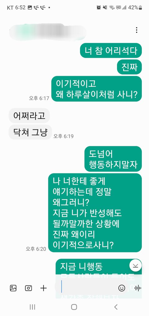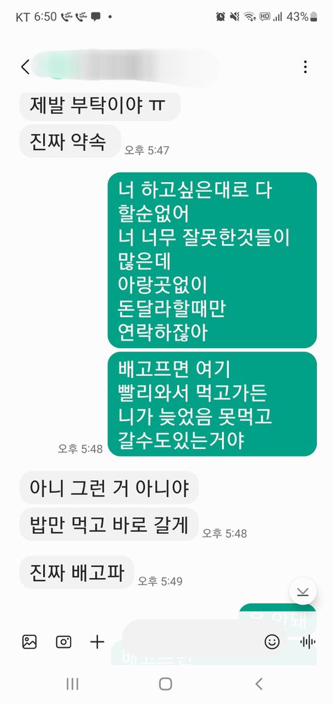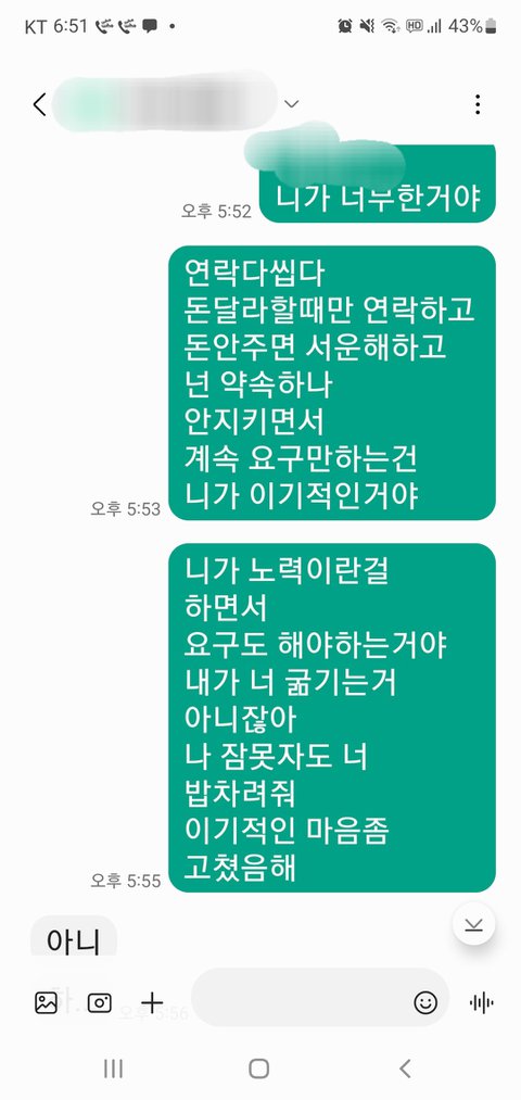 문자만 보면 외박한동안 애달프게 연락한거 같지만, 실상 밥살돈도 안주면서 '이기적인애'로 호통치면서 '요구만 하는애'로 만듬.