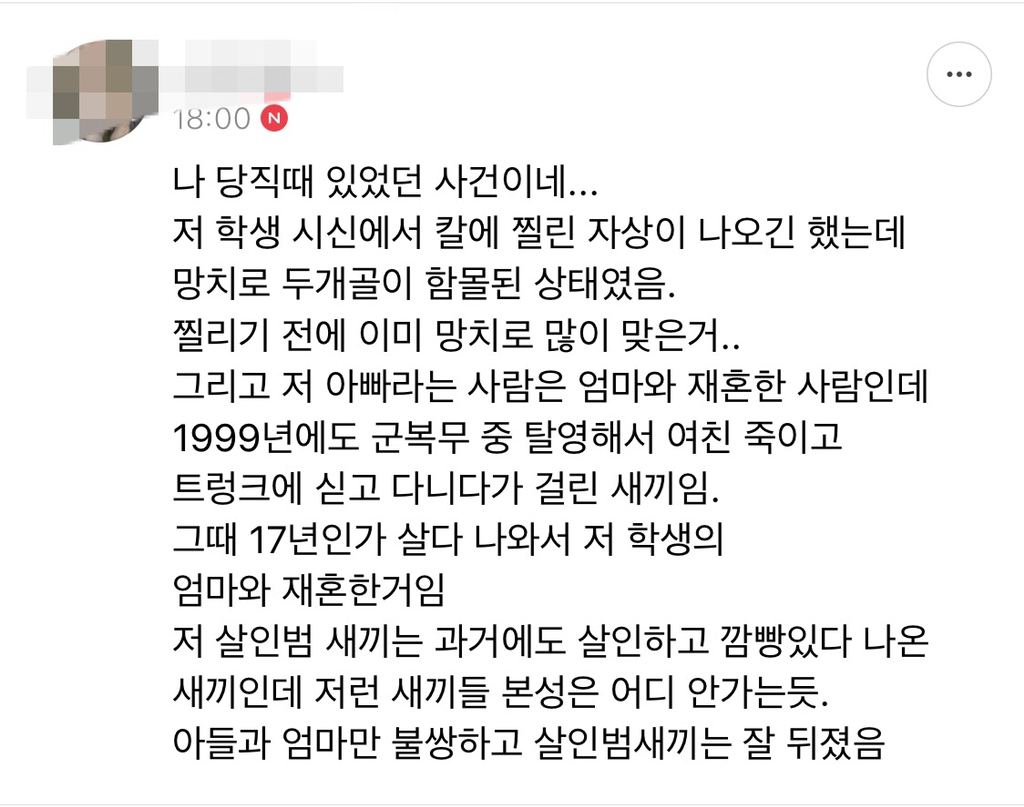 그리고 저 아빠라는 사람은 엄마와 재혼한 사람인데 1999년에도 군복무 중 탈영해서 여친 죽이고 트렁크에 싣고 다니다가 걸린 새끼임.