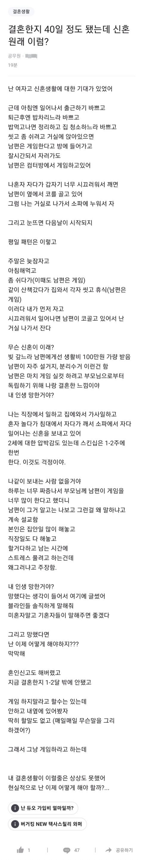본문은 자신이 뭘 해결하고 싶은지 결혼에 대한 기대가 있었다는데 구체적으로 뭐에 대한 기대인지 안써있어 로맨틱이 없어서 불만인지는 알수 없음. 남편이 게임을 많이한다+본인은 결혼후 가사만 잔뜩하고 여유가 없다+주2회=결혼 망했다=인생망했다???