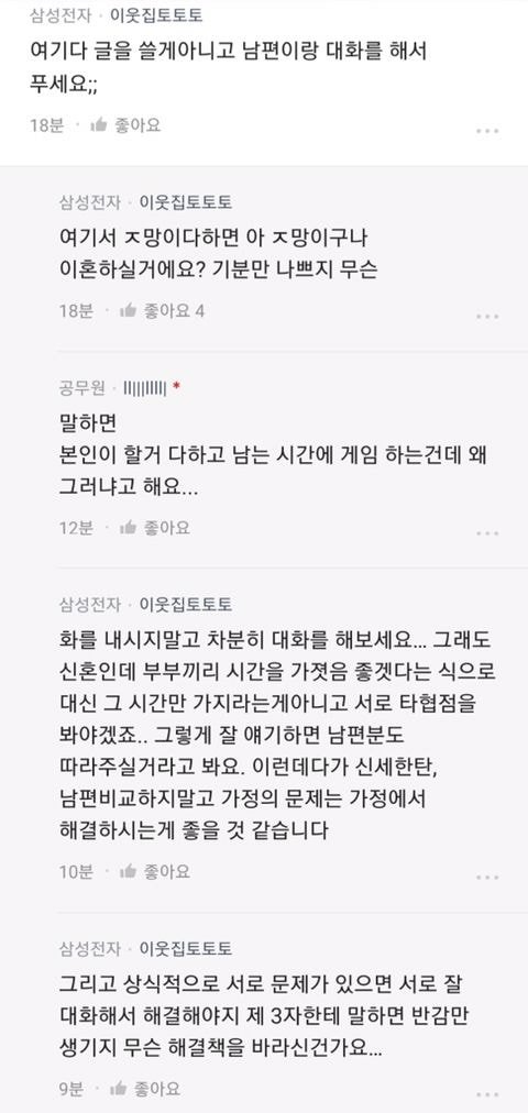 2. 가사분담 : '결혼하면 잘하겠지'라며 결혼전 합의를 정없다는 생각이 불화의 씨앗이된다. 남편이 설거지/분리수거 뿐이면 여자는 청소/빨래/요리/장보기를 다한다는건데 맞벌이 가사분담으로 턱없이 불평등하고 과중하다. 청소는 어떤방은 누가 이렇게 나누든가 번갈아 하든가, 빨래하면 개키고 다림질은 누가 이런식으로 더 할당해야함. 게다가 얘기 해봤다는데 남편이 "할거 다하고 남는시간에 게임하는게 뭐가문제냐"고 말할정도면 제대로 조율은 커녕 남자한테 '게임하지말라'고만 말해서 남편은 가사일이 얼마나 많은지 파악도 못함.