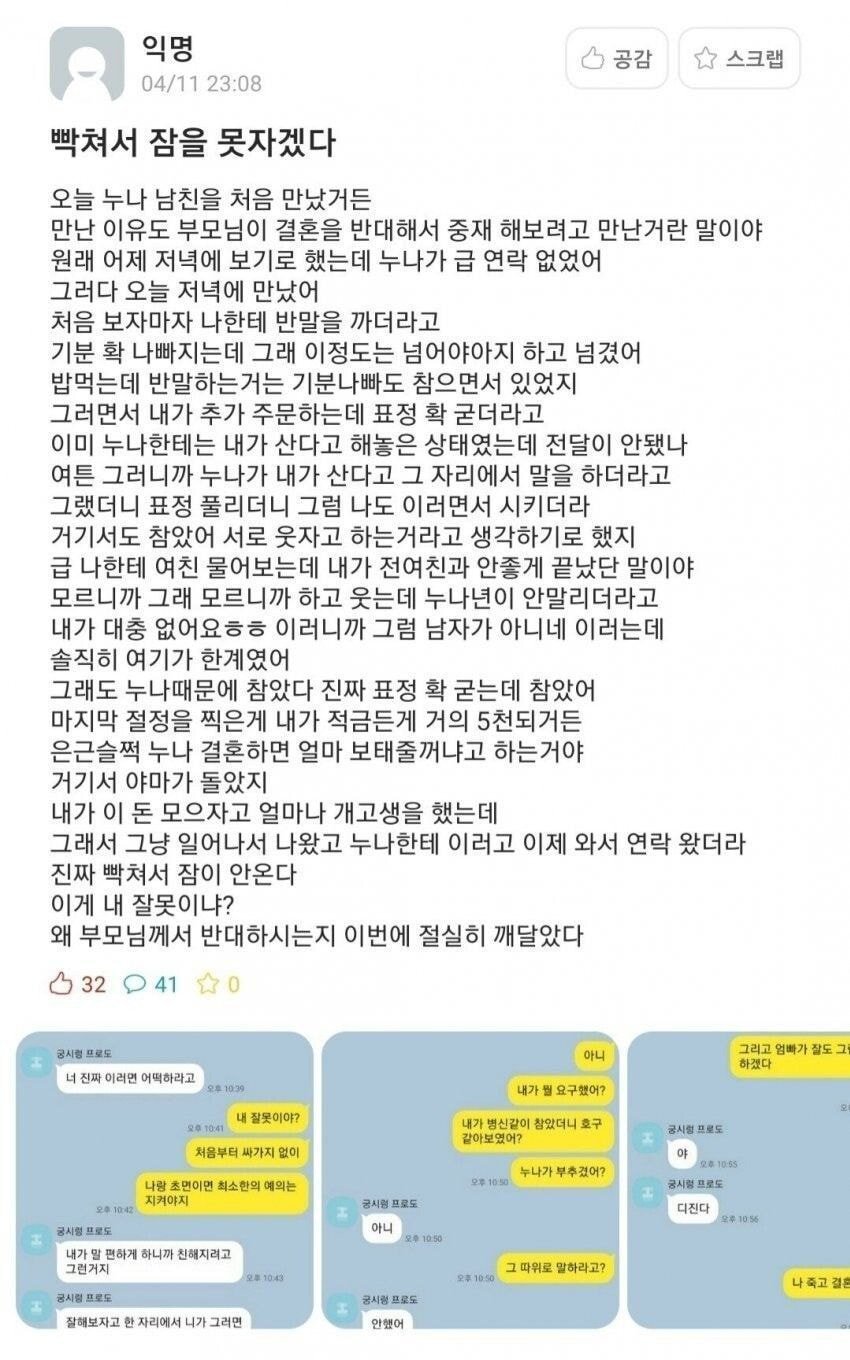근데 가뜩이나 부모님의 반대하는 결혼에 남동생 5천만원이 아쉬운 결혼하면서 남동생 학비를 대주느라 대학포기하고 공장간 수준아니면 당당히 요구할 수 없는데 동생이 화가 났다는데도 신경긁는 남친 통제 못하는게 이해 안감. 누나나 남친이나 구걸하는 주제에 정중함은 눈꼽만큼도 없음.