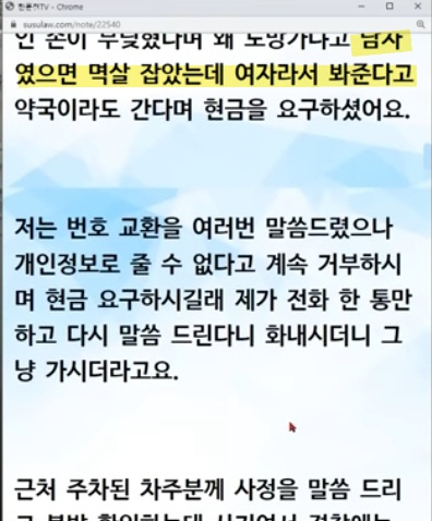 차주는 "몰랐다, 죄송하다, 연락처 교환하자(괜찮다고 해도 그냥 가면 뺑소니범, 명함이나 연락처 줘야함)" 했는데 사기범이 개인정보 운운하며 거부. 뺑소니로 신고 안할테니 약값만 달라했는데 수상함을 느낀 차주가 전화 한통하고 말씀드리겠다 하니 화내고 가버림. 아마 경찰에 신고한 것으로 예상한 사기남이 튄것.