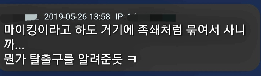'마이킹'이라는 게 일본어 前金마에킹에서 유래된 한국말로 선금인데 탈출하려니까 돈을 갚았어도 차용증을 돌려주지 않고 또 돈갚으라고 못빠져나가게 하는 수단 이거나 꼬투리 잡아 빚을 더 늘려가는 수단으로 쓰이나봄. 그러니 5번 돈을 갚았다면 차용증 돌려받거나/갚았다는 확인증 또는 영수증/이체내역을 만들어두면 된다.