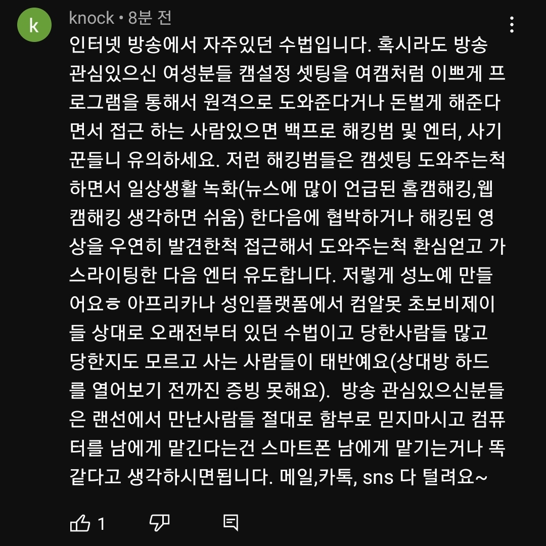 방송 관심있으신분들은 랜선에서 만난사람들 절대로 함부로 믿지마시고 컴퓨터를 남에게 맡긴다는건 스마트폰 남에게 맡기는거나 똑같다고 생각하시면됩니다. 메일,카톡, sns 다 털려요~