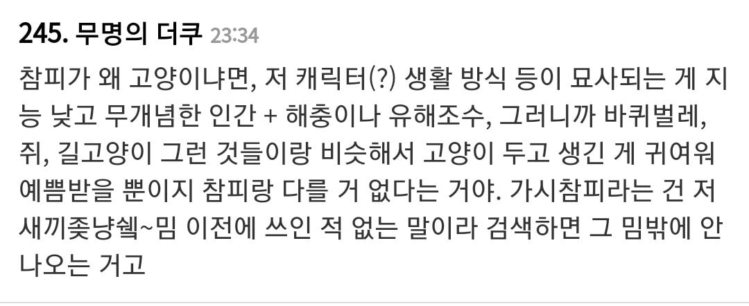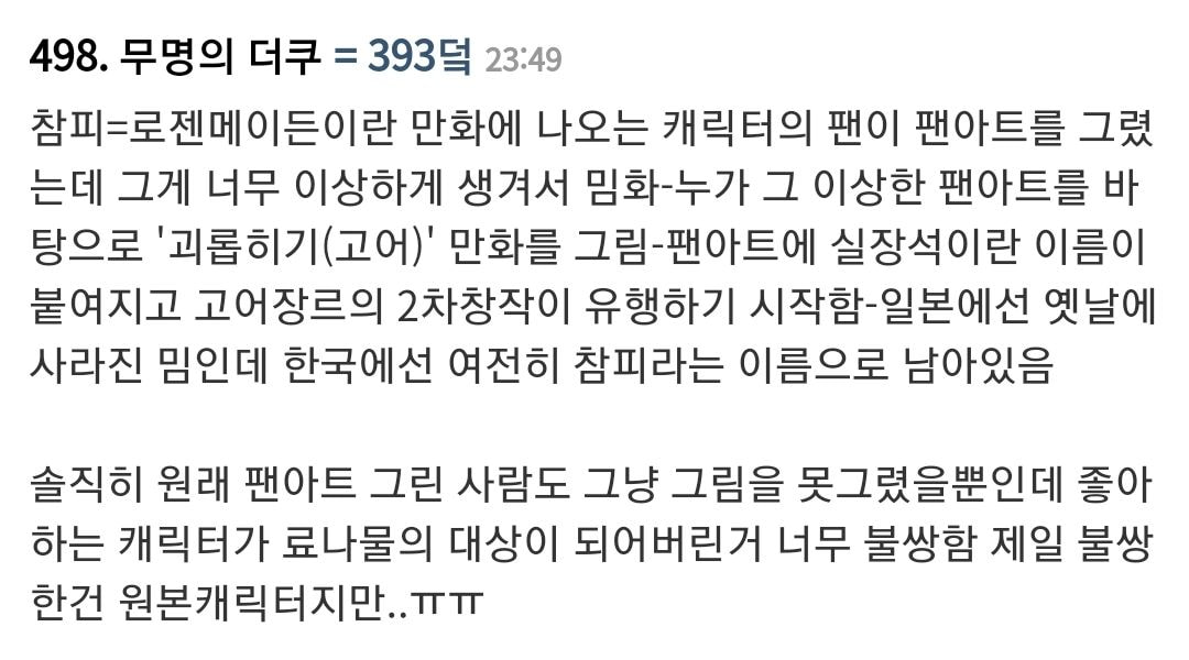 원래 실장석이라고 일본에서 스이세이세키로다가 만들어낸 2차창작 캐릭터인데 저걸로 가학적인 행위하는 고어밈이 흥해서... 국내에는 어떤 디씨갤러가 참피라는 이름으로 만화그린 적 있어서 참피로 통함.