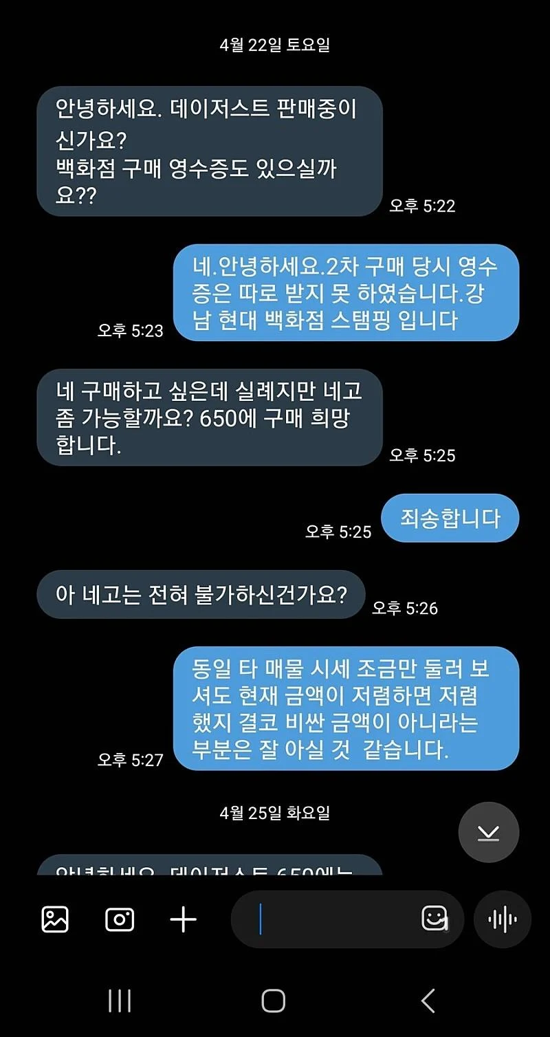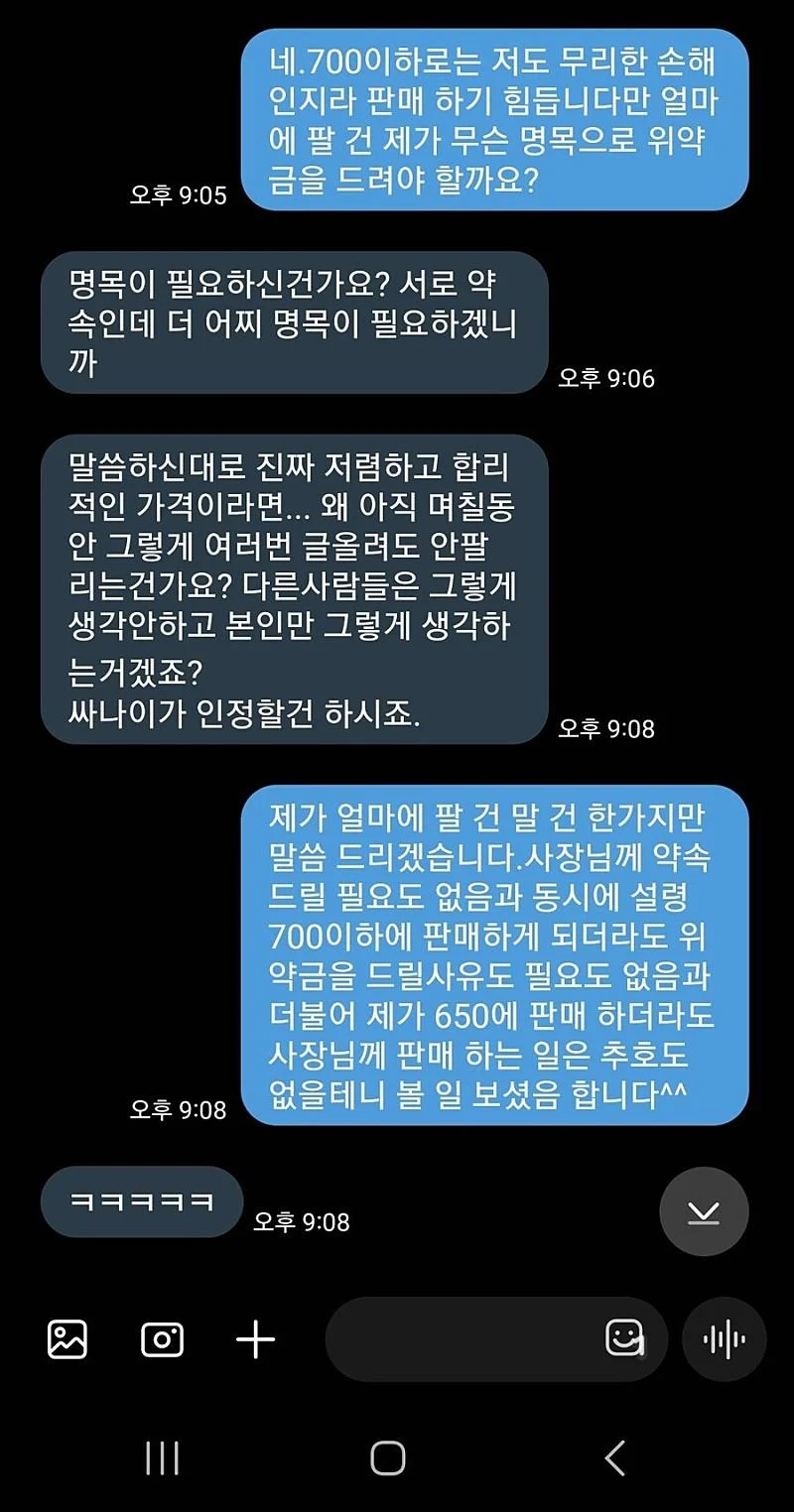 1 문자상 판매자 진상남은 어떤 거래도 하지 않음. 돈이 오가지도 않고 생판남이 특정금액 이하에 팔면 위약금 20만원이라는 판매자에만 책임과 돈을 배상해야하는 일방적이고 시건방진 요구를 하고있음.