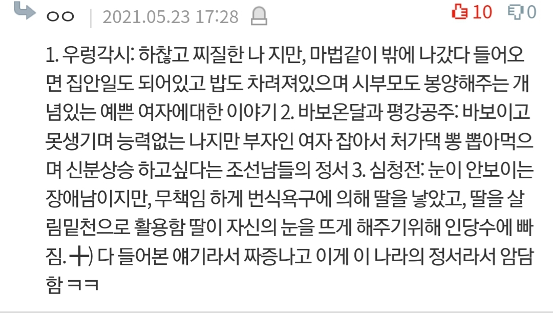 쓰니 말이 맞는 말은 맞음. 실제로 가난이라고 말하기는 쫌 그렇지만 금전적으로도 정서적으로도 여유 있지 않은 시댁 때문에 고생하는 지인들 많은데, 보통 경제력이 안 좋으면 시짜짓을 더 하는 것 같기도 하더라. 여유가 없으니까 강퍅해지고 그런 모습을 시짜짓이라고 하는 거겠지만.. 근데, 모든 남자가 그런 것도 아니고, 모든 여자가 멀쩡한 것도 아님. 그냥 몇몇 예일 뿐. 이런 글이 남녀혐오를 부추긴다고 생각함. 유리천장이 있는 시대, 더 이상 개천에서 용 나지 않는 사회, 사회적 군상이 불평등하면 수직으로 싸워야 하는데 왜 자꾸 수평으로 싸우려고 드는지.. >>위로 싸우는거보다 약자와 싸우는게 도태남에겐 더 쉽기 때문 굴절폭력