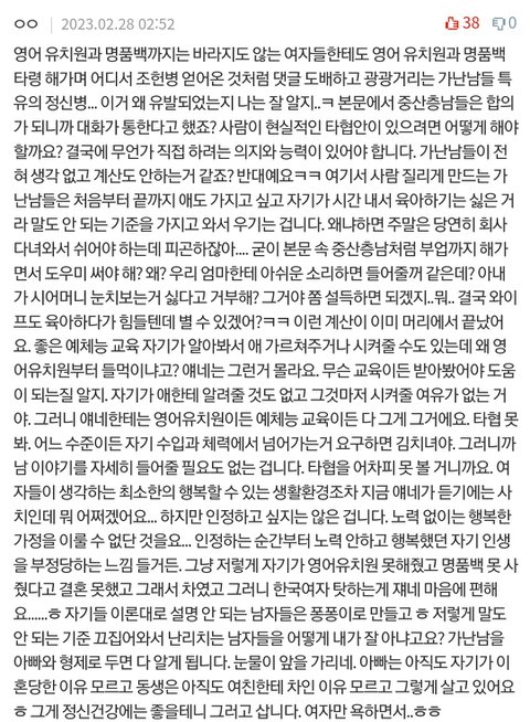 결혼하기전에 개념녀였는데 결혼하고 맞벌이중에 아이 키우고 있으니 이거 공감됨. 우리 남편은 여기에 추가로 돈 얼마 모았냐. 왜 그거밖에 없냐도 추가였음. 아니 돈도 벌고 애도 키우고 애 보는 비용도 나가는데 뭐 사치한줄알아ㅋㅋㅋㅋㅋ 둘이 이만큼 벌면 많이 모았을 거고 자기가 준게 얼만데 이게 기본 값으로 들어감. 오죽하면 개빡쳐서 니가 관리하라고 했더니 주식으로 6천 날렷....하..미혼 친구 후배들에게 무조건 외벌이하게 해주는 능력과 형편의 남자 만나라고 함. 결혼해서 애 낳아보면 같은 동네에 사는데 외벌이가 더 잘살고 국가지원 혜택도 더 많고(우리만 전세살이인데 기저귀 바우처 못받음ㅋㅋㅋㅋ망할 소득기준..) 청약도 잘되고 (망할 소득기준 2) 암튼..맞벌이로 애 키우지 말라는 나라임.. 회사의 워킹맘들 보면 느껴질거여..
