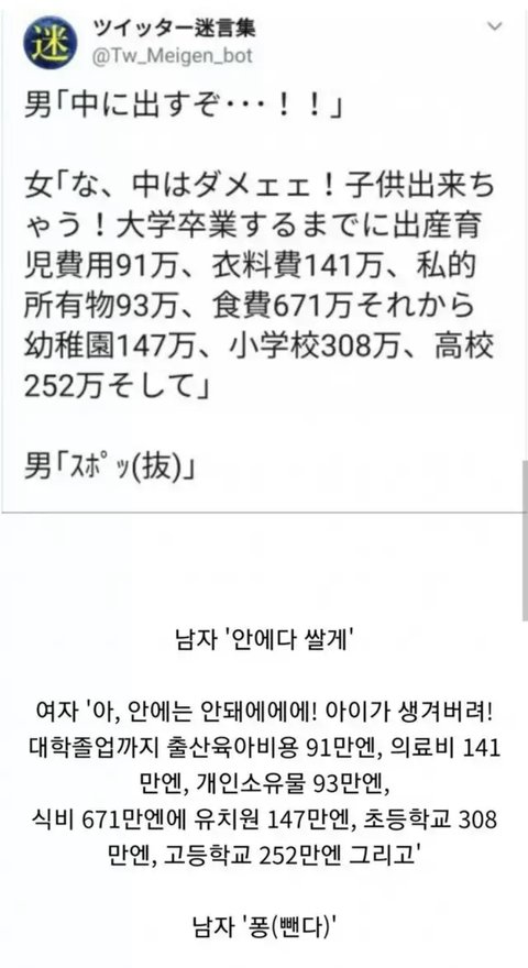 - 출산은 본인이 하는거 아니니까 아내 몸은 강철체력이라 애 낳고 바로 일 나가서 맞벌이 해올거라 믿음. 아이도 저절로 자랄 줄 앎ㅋㅋ 아이는 누가 키우냐니까 요즘 다 할머니가 봐주신다고 함. 자기가 할 거란 얘기 하나도 없음ㅋㅋㅋㅋㅋ