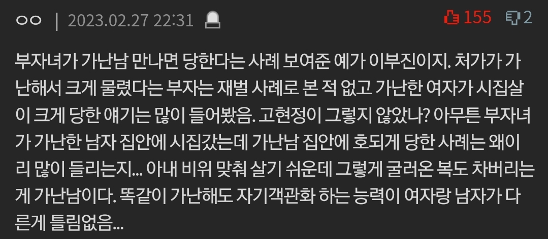 부자녀가 가난남 만나면 당한다는 사례 보여준 예가 이부진이지. 처가가 가난해서 크게 물렸다는 부자는 재벌 사례로 본 적 없고 가난한 여자가 시집살이 크게 당한 얘기는 많이 들어봤음. 고현정이 그렇지 않았나? 아무튼 부자녀가 가난한 남자 집안에 시집갔는데 가난남 집안에 호되게 당한 사례는 왜이리 많이 들리는지... 아내 비위 맞춰 살기 쉬운데 그렇게 굴러온 복도 차버리는게 가난남이다. 똑같이 가난해도 자기객관화 하는 능력이 여자랑 남자가 다른게 틀림없음...