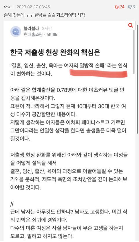 진짜 웃기는 나라임 김여자 된장녀 등 인터넷 2000년대 초반에 활성화 되자마자 일방적으로 여자들 패오고 혐오해오다 여자들이 반격하기 시작하니 지네들이 시작한 건 입 싹 씻고 성별 갈라치기 갈등조장 운운하다 또 지버릇 개 못 줘서 퐁퐁남 설거지남 만들어내 여자 또 패고 여자들 무시하고 패는데 누가 좋다고 너네랑 연애 결혼 출산 하겠냐 출산율 0.78 찍으니까 성별갈등 문제야 호들갑 떨다가도 또 여자 패는 버릇 못 참고 애 안 낳을 거면 군대라도 가라고 사회에 기여 안하는 버러지 취급하고 걍 노답