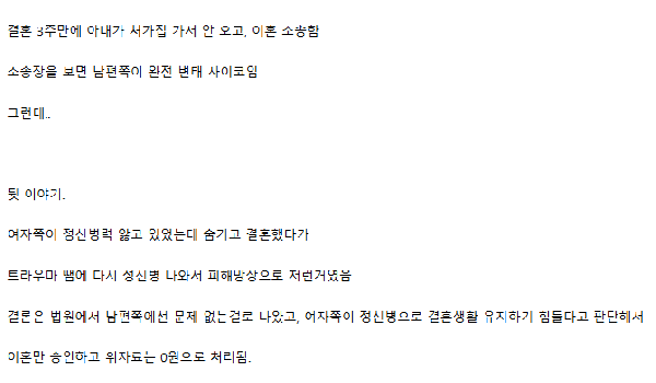 제3자가 그냥 글쓴남이 억울하다 이한마디에 여혐하려고 결혼피해자를 '여자가 정신병력 숨기고 결혼했다가 트라우마 때문에 정신병 재발'이라는 기괴한 서사를 덧입혀서 미친여자로 몰아간게 소오름.