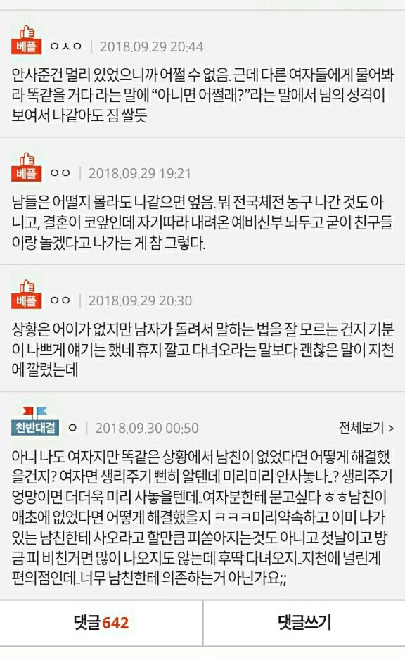 찬반댓글 남자가 썼음 어디서 주워들어서 생리하면 어떤상태인지 생리나오는데 후딱다녀오라는 한남대가리 ㅁㅊ
