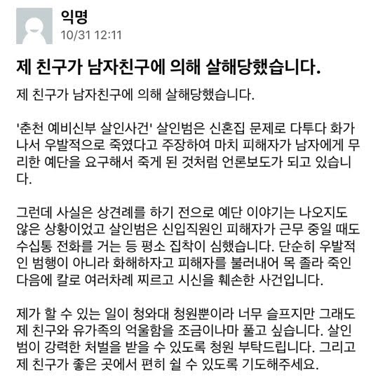 2018.10.24.(수) 21:30 춘천에서 발생한 20대 예비신부 살해사건 피해자의 유가족(외삼촌)입니다. 피해자(조카)의 억울한 죽음을 풀어주세요.(피해자 이씨 23세/여, 살인피의자 심씨 27세/남)