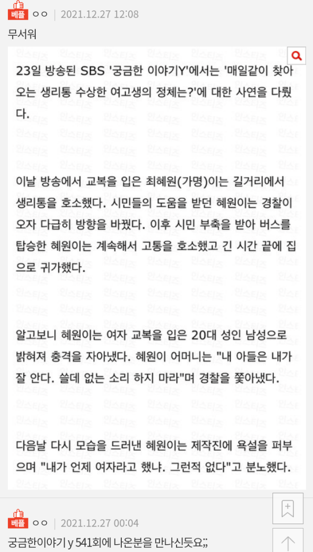 지는 태어나서 한번도 겪어보지도 않았을 '생리통'을 한다며 시민들에게 관심을 끌고, 어딘가로 데려다달라는 뉘앙스로 상황을 몰아간게....
