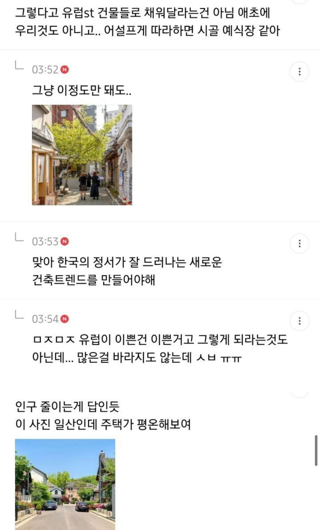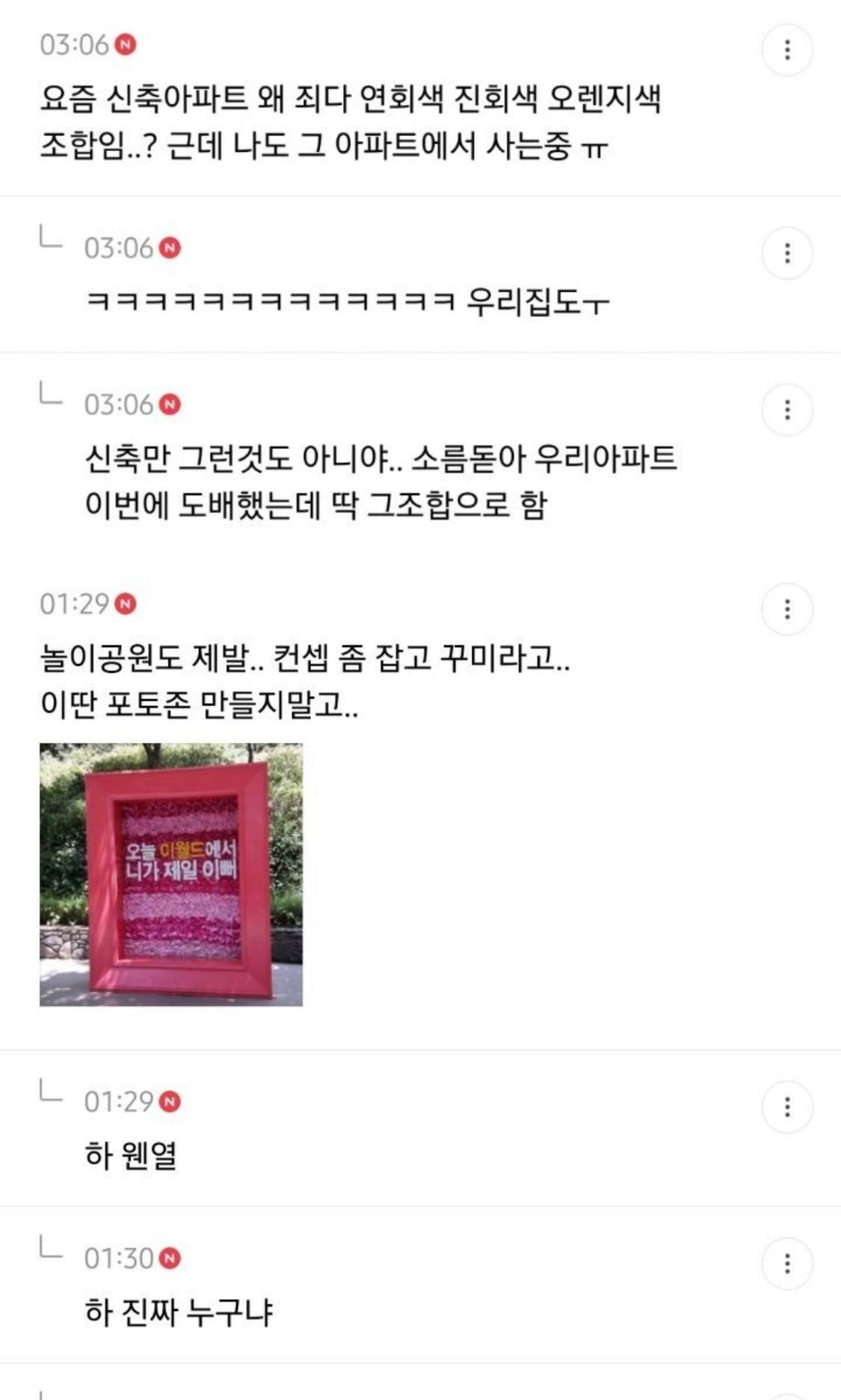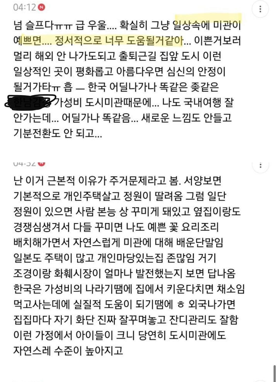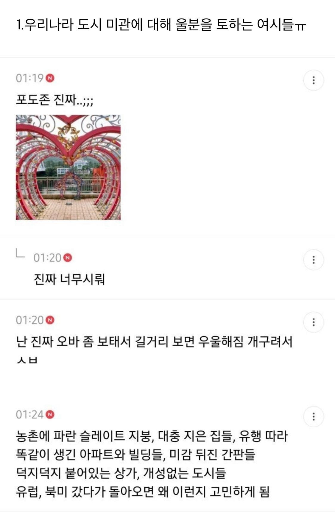 커뮤니티발 한국의 도시미관에 대해 성토글에서 커뮤에서 단순히 유행이나 관심사에서 사회문제로까지 집단지성하기 시작했음을 알 수 있다.