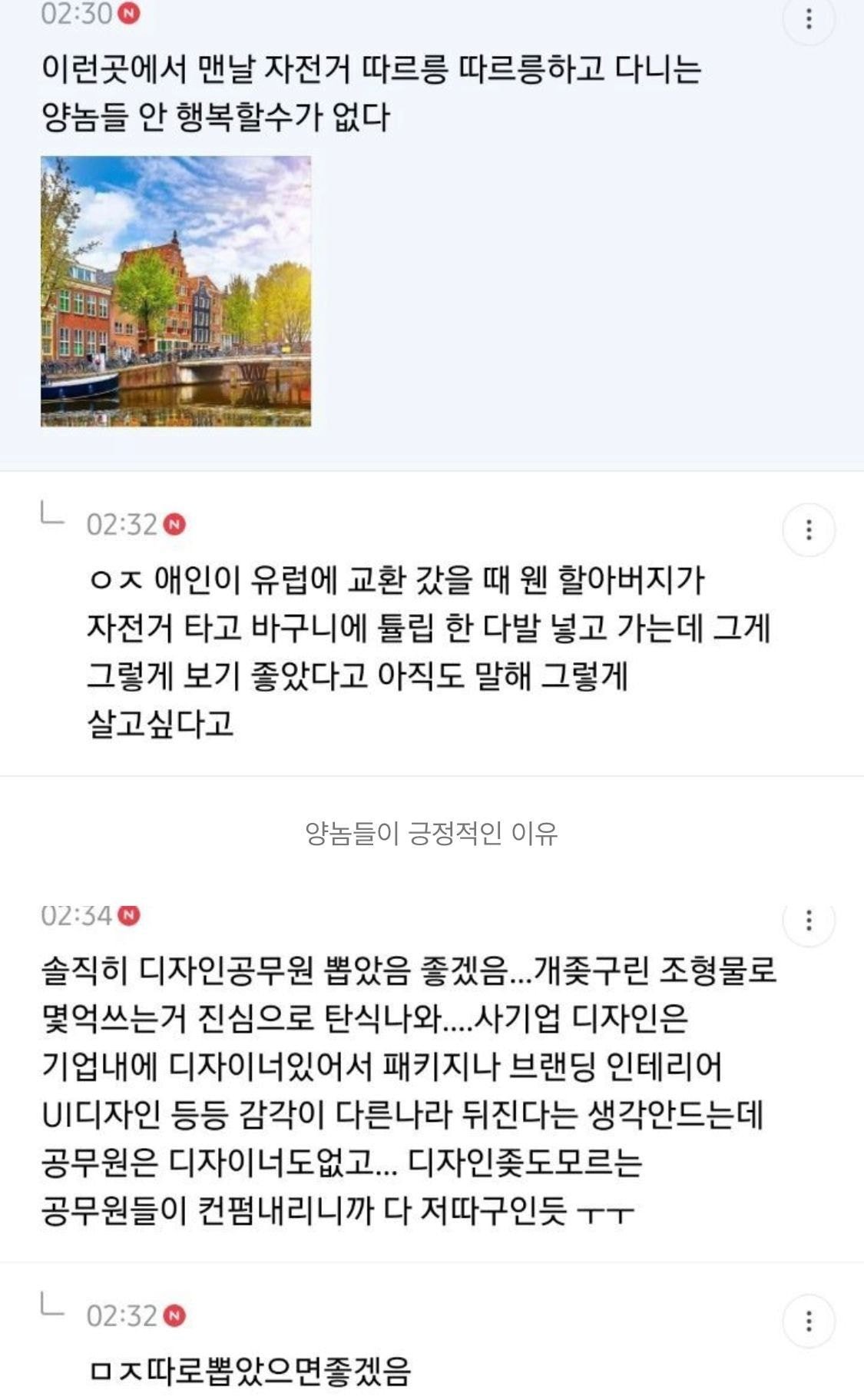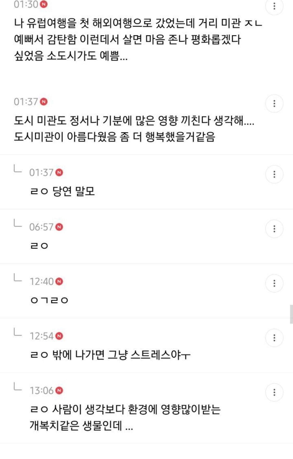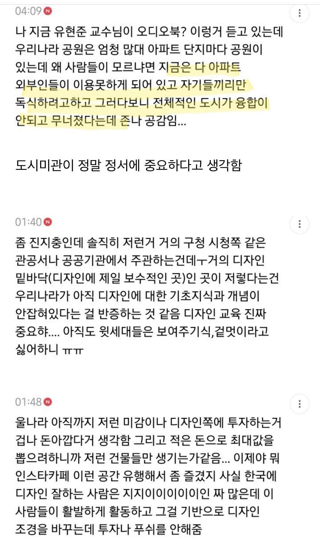 일단 도시미관 주제는 외국경험을 통해 한국과 외국의 차이를 몸소 느낀바+현직자 등판+사회역사적 추론이 복합적으로 나타나고 있어 흥미롭다. 단순히 예전의 '헬조선식 자조'로 그치지 않고, 애국심을 담아 디자인공무원 등의 자발적으로 발전방향을 제안을 하는 등 건설적인 해결방안을 강구하며 피력하고 있다.