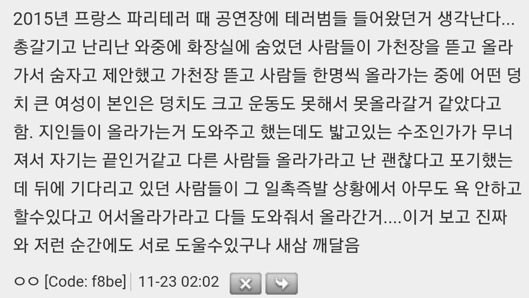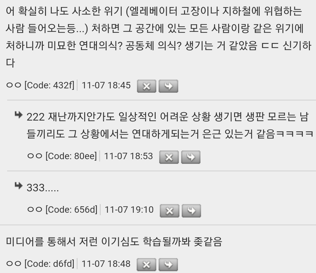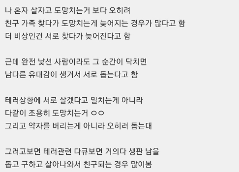 또 함께 죽음을 헤쳐 나온 사람들 사이에는 일종의 전우애 같은 끈끈함이 나타나곤 한다. 런던 테러에서의 한 생존자는 “1분 전까지 낯선 사람이었던 사람이 어느덧 세상에서 가장 가깝고 중요한 사람처럼 느껴지는 경험을 했다”고 언급했다. 극한 상황에서는 되려 나와 타인의 경계가 모호해지고 타인의 안전이 곧 내 안전인 것처럼 느껴지는 현상들이 나타나는 것이다.