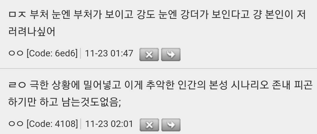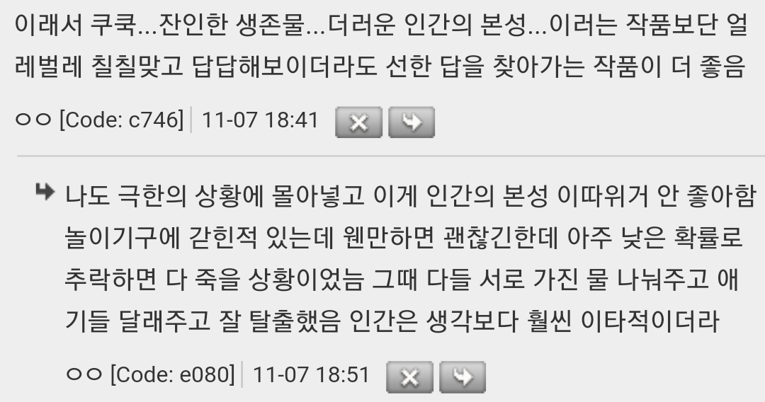 인간수업, 스위트 홈, 오징어게임같은.스토리를 싫어한다. 인간의 본성 만다고 파헤치노. 인간이 본성을 드러내지 않고 같이 잘 살 수 있으려고 인류가 반만년 걸려 얼마나 열심히 발전시킨 문명인데.